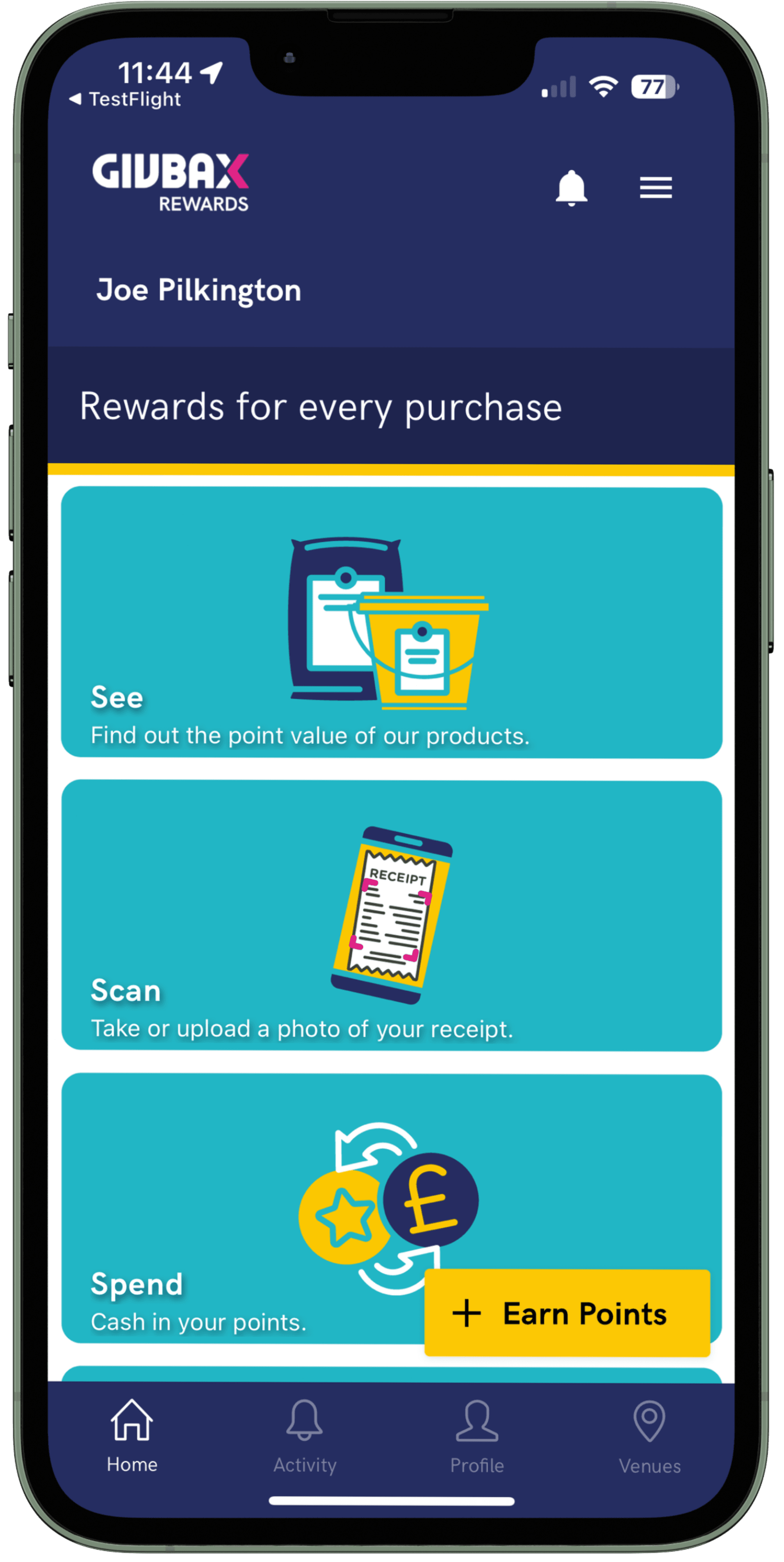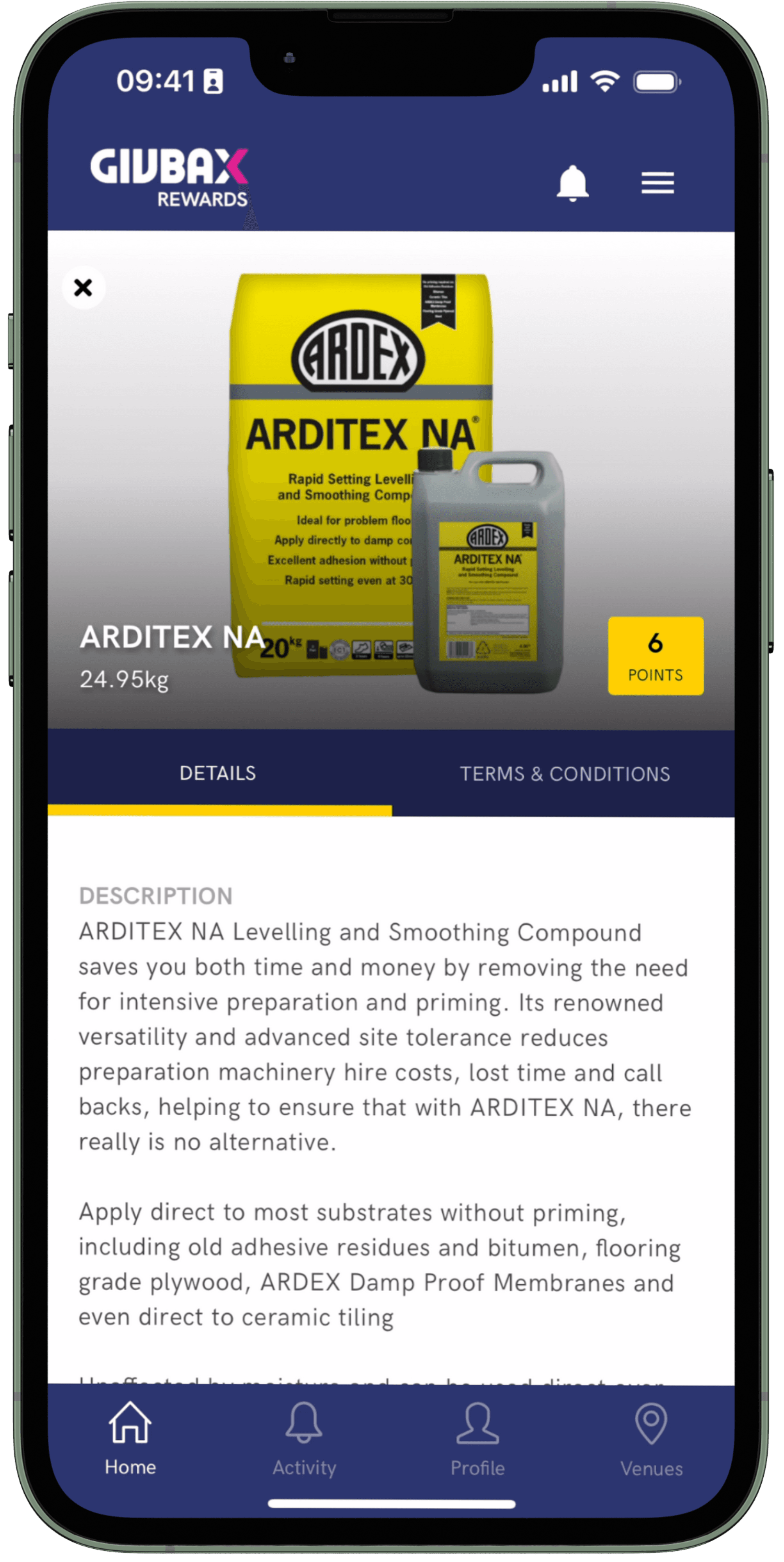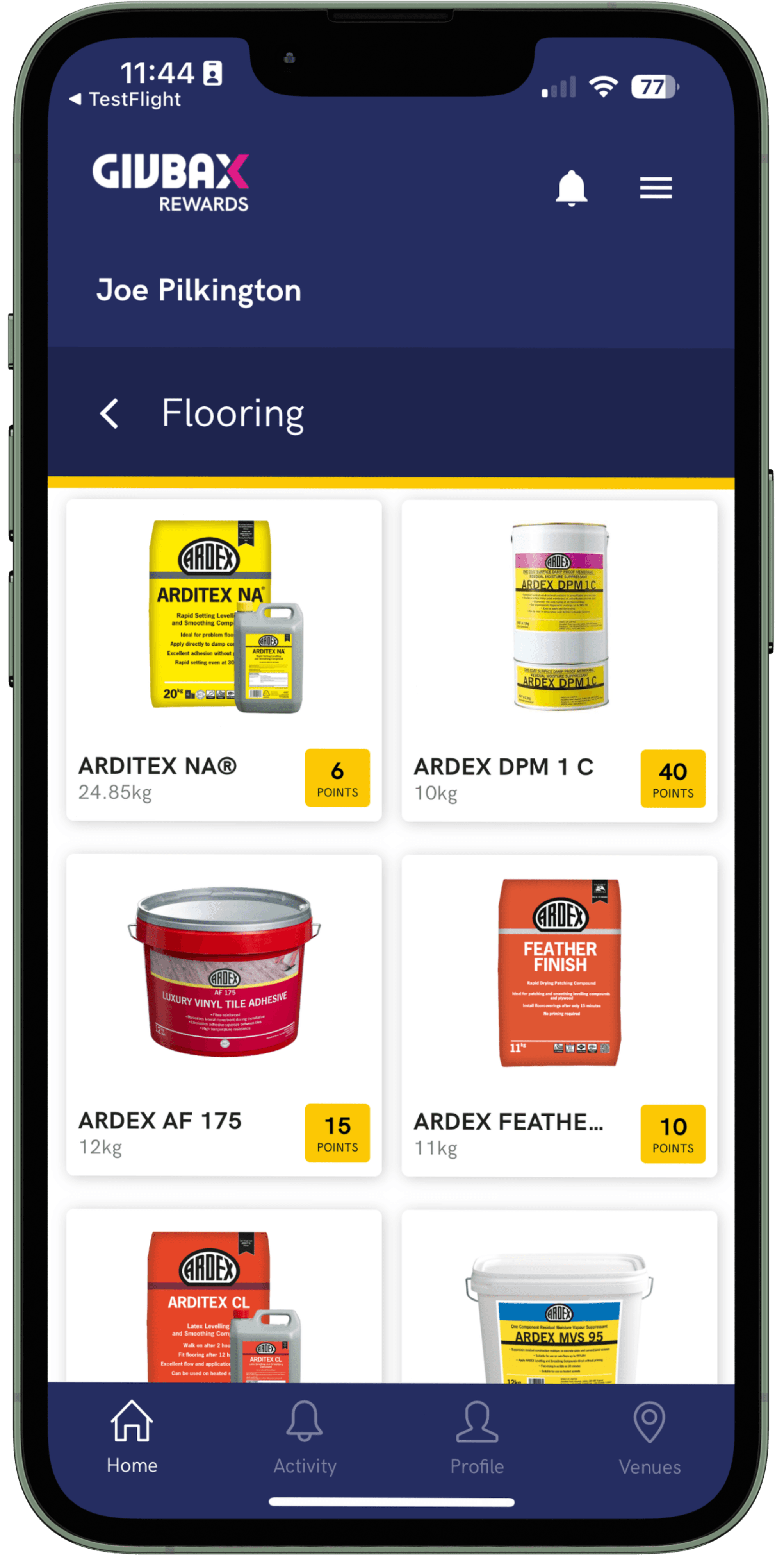 We created GivBax Rewards, an end-to-end loyalty program that rewards ARDEX and BAL customers for buying their products from any distributor in the UK. Using our receipt scanning technology, customers are awarded a set number of points for every purchased product.